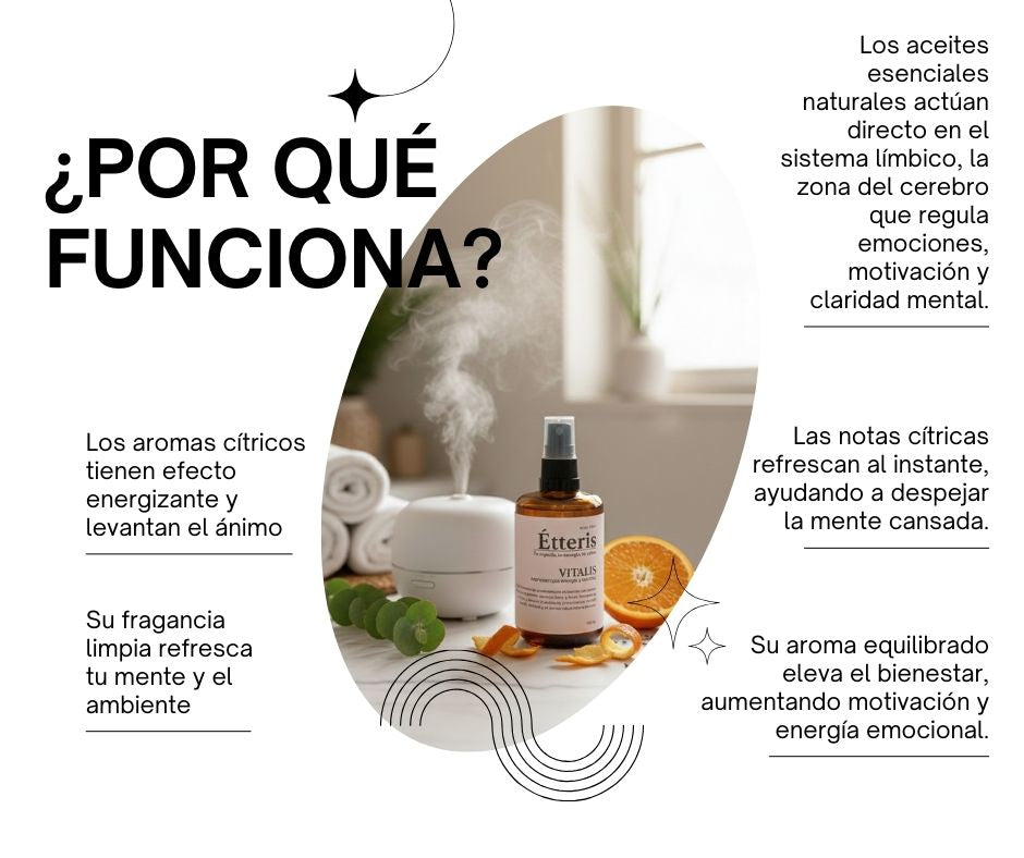 La mayoría intenta combatir el cansancio con café o azúcar, pero eso solo genera bajones. Étteris Vitalis trabaja distinto: su mezcla de pomelo, naranja dulce, y limón eleva tu vitalidad desde la aromaterapia, equilibrando tu mente y cuerpo.